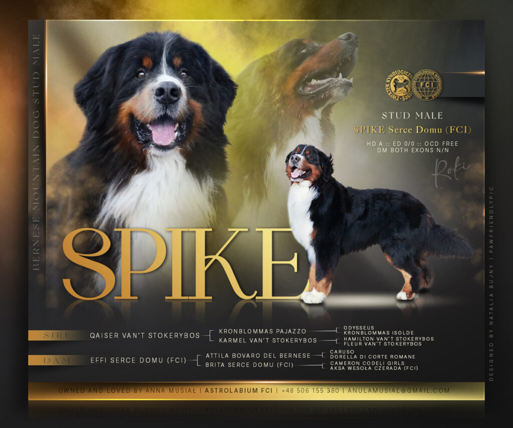 Obecnie jedyny berneński królewicz w stadzie naszych księżniczek. Jak dotąd ojciec 39 dzieci. Nieustępliwy i doskonały reproduktor. Wszystkie chętne panny berneńskie zapraszamy do korzystania z jego usług. Oczywiście tylko panny z rodowodem oraz uprawnieniami hodowlanymi i przynależnością do ZKwP.